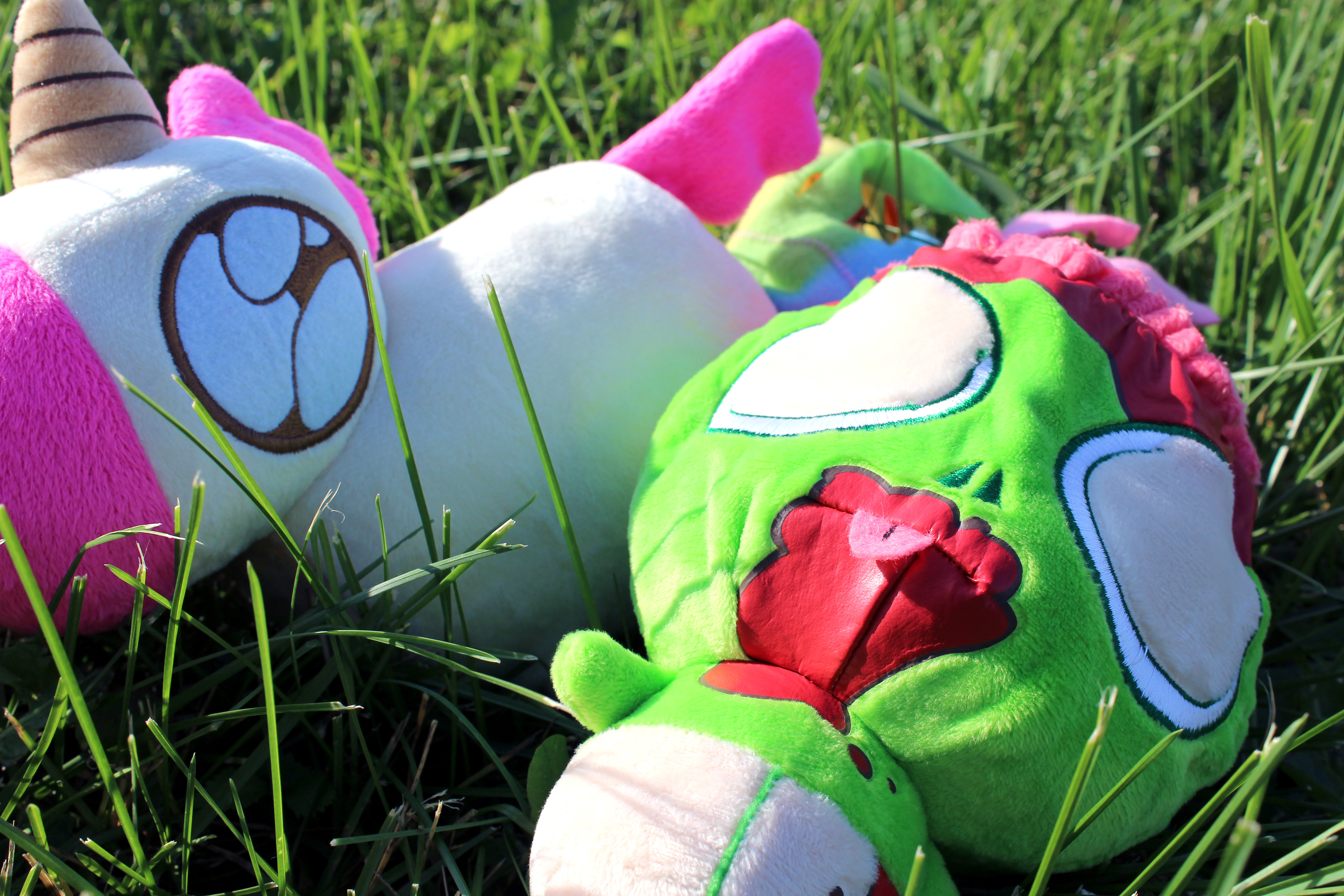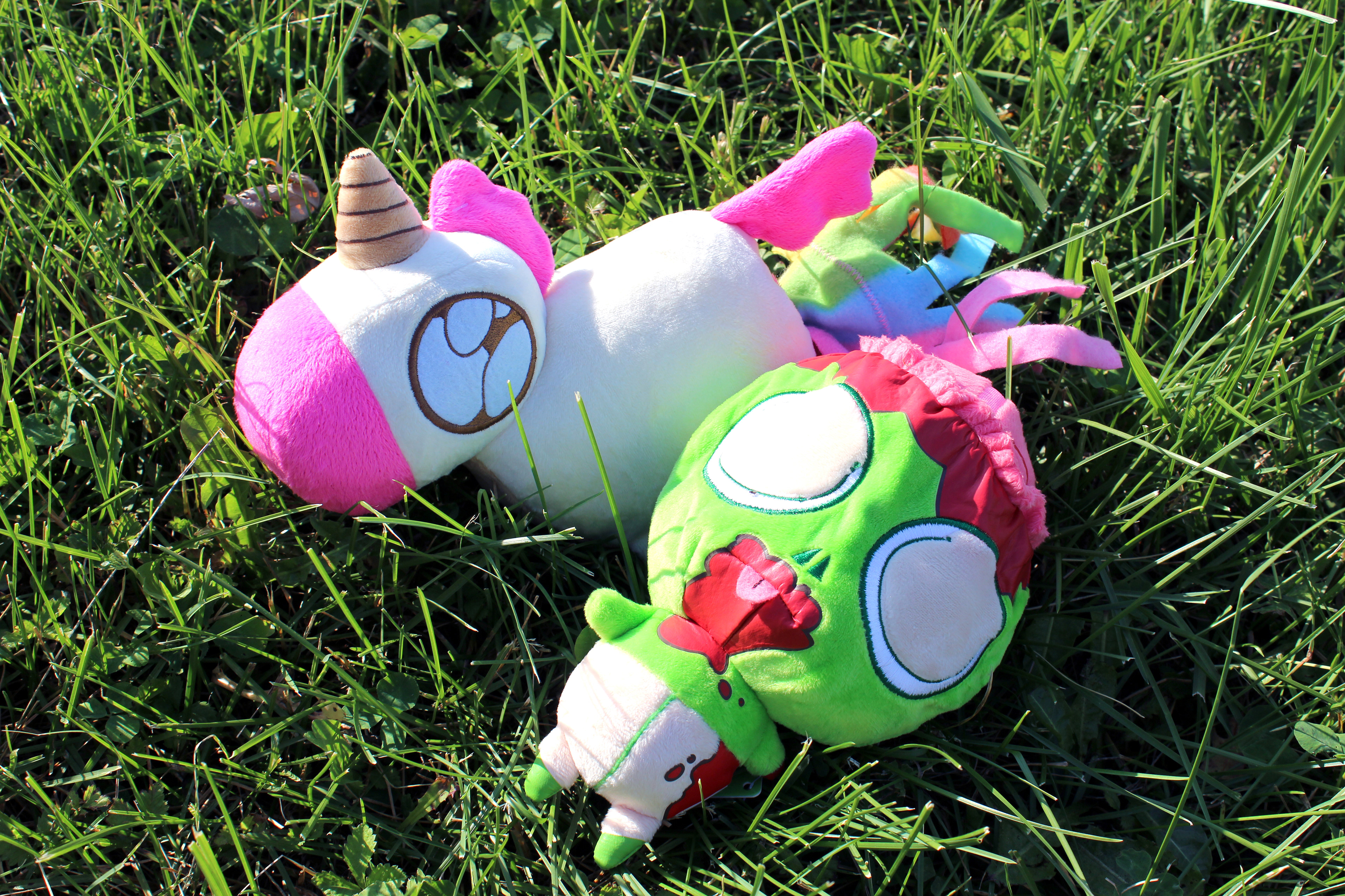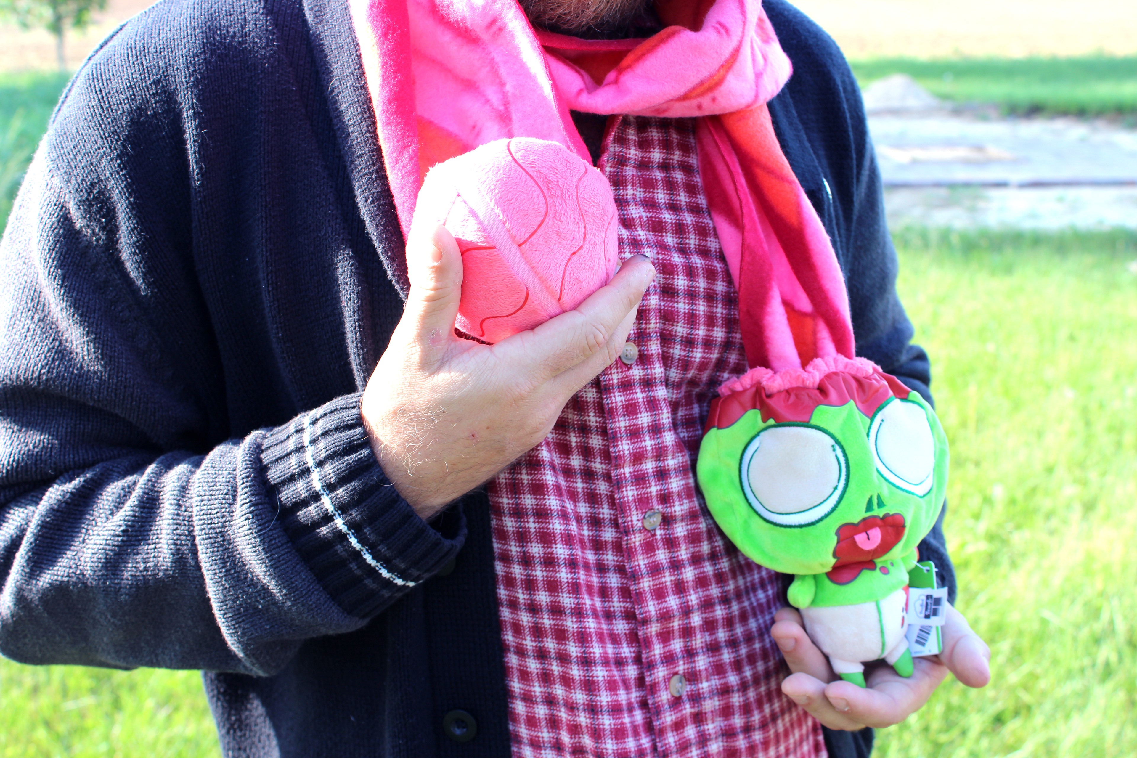 This is an amazing project that I did with Fun to 11. It started as an idea I came up with while at a state fair, and thanks to Fun to 11, it became a reality. Doodle the unicorn has a warm rainbow poop scarf, and George the zombie has a lovely entrails scarf with a plush brain at the end. I even designed the custom printed fabric for the scarfs!